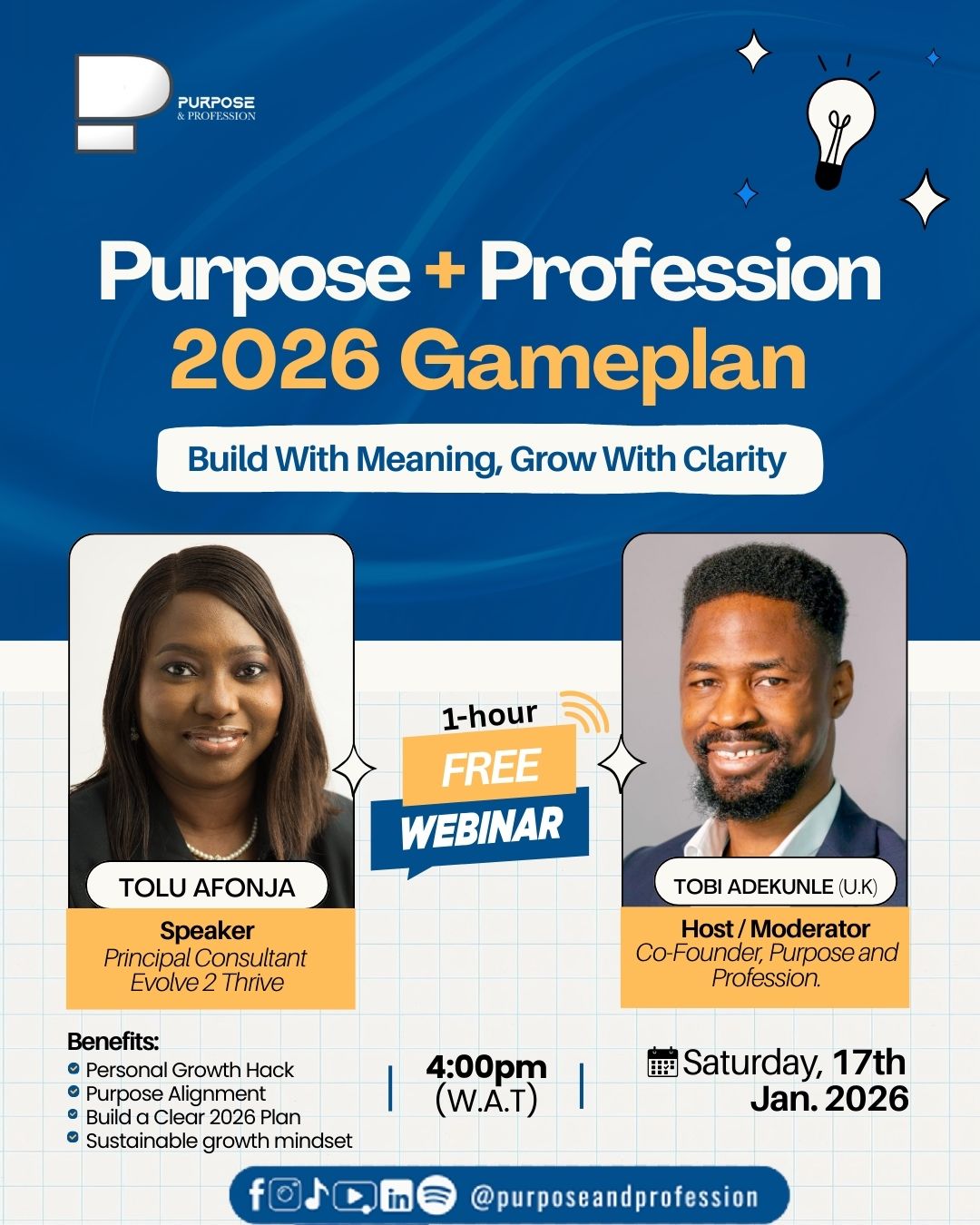 Purpose × Profession 2026 Gameplan is a live, guided webinar designed for individuals who want to enter the new year with clarity about their work, their direction, and the kind of life they are intentionally building. It creates space to pause, reflect on the year that has passed, and thoughtfully align purpose with profession in a way that is practical, realistic, and sustainable.